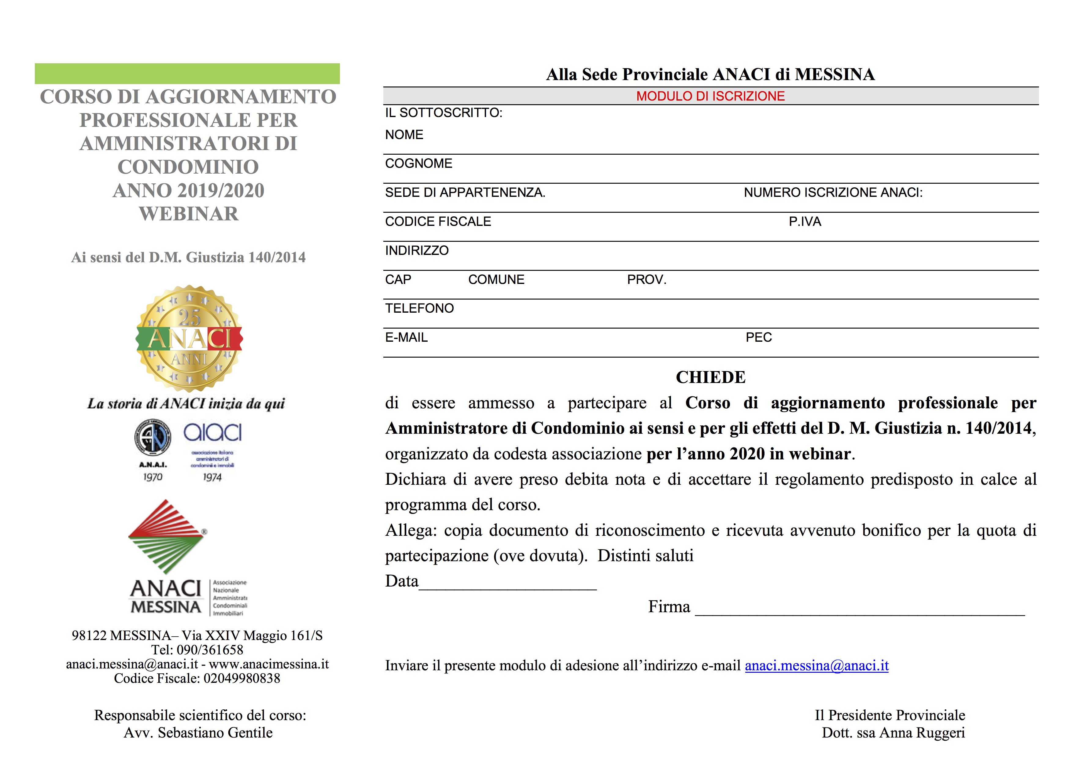 Il pagamento dovrà essere effettuato a mezzo bonifico bancario alle seguenti coordinate IBAN: IT 80 V 07601 16500 000086565058 ANACI SEDE PROVINCIALE DI MESSINA – POSTEITALIANE. Le quote versate non saranno restituite.